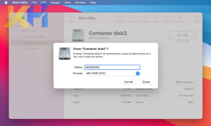 Click phải vào mục Container đó → Erase → Đặt tên: WINDOWS → Format: MS-DOS (FAT) → Scheme: GUID Partition Map → Erase.→ Lúc này phân vùng đã sẵn sàng nhận Windows.